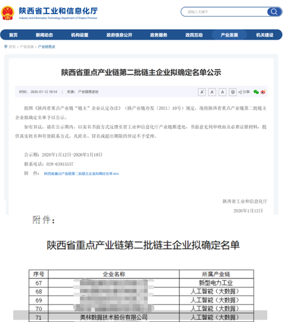 近期,陕西省工业和信息化厅按照《陕西省重点产业链“链主”企业认定办法》(陕产业链办发〔2021〕10号)规定,公示新一批陕西省重点产业链链主企业拟确定名单,美林数据技术股份有限公司入人工智能(大数据)产业链链主企业。