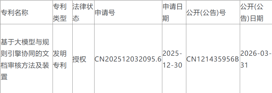 近期,国家知识产权局信息显示,美林数据技术股份有限公司申请一项名为“基于大模型与规则引擎协同的文档审核方法及装置”的专利,授权公告号CN121435956B,授权公告日为2026年3月31日。申请公布号为CN121435956A,申请号为CN202512032095.6,申请公布日期为2026年3月31日,申请日期为2025年12月30日,分类号G06F40/20、G06F40/16、G06N5/04。